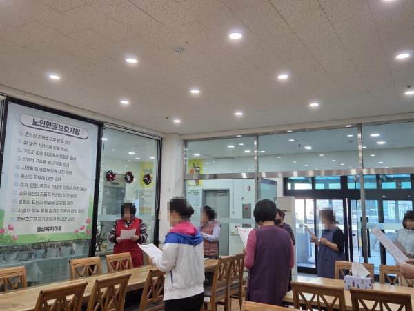 매일 업무전 전 직원들이 노인인권보호지침을 함께 읽으면서 노인의 인권에 대해 이해하고 노인인권침해를 예방하는 마음가짐을 갖고 업무를 시작합니다.